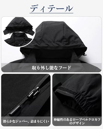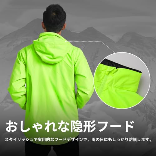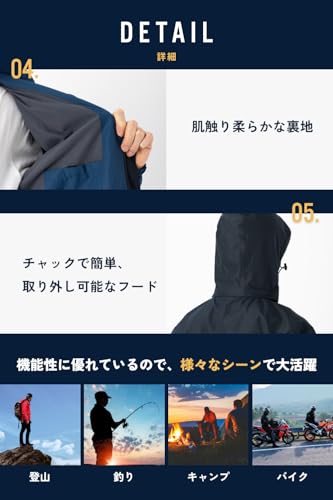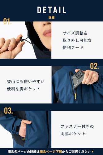 登山やトレッキングなどでは、急な天候の変化が避けられないため、防水性能と動きやすさが重要になります。エックスシェルターのトレッキングモデルは、耐水圧20,000mmの高機能フードと3D立体裁断を採用し、斜面での視界確保と身体の動きへの追従性を両立しています。特にフードの構造は、顔周りにフィットしながら雨を効果的に遮る工夫がされており、強風時でもズレにくい点が評価されています。