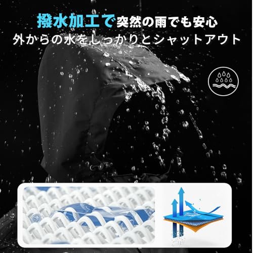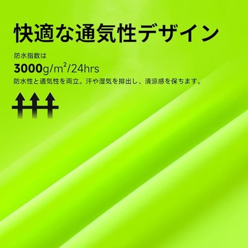 透湿性にも優れており、多層疎水性ポリプロピレン素材による「骨格三次元構造」が採用されています。この構造は空気の流れを妨げず、従来品と比較して透湿速度を4倍に向上させるとともに、摩擦抵抗も約34%軽減する効果が確認されています。その結果、汗によるムレや不快感を軽減しながら、撥水性能を長期間維持するという点で、非常にバランスの取れた素材設計がなされています。