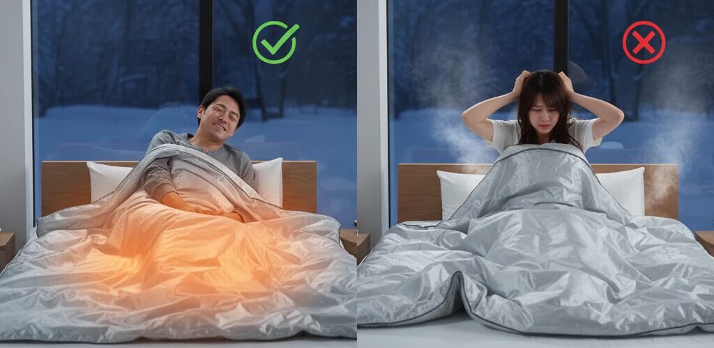 このかけ方により、エアロゲル毛布が「フタ」のような役割を果たし、羽毛布団が蓄えた体温を外に逃さず、同時に外からの冷たい空気を強力にブロックしてくれます。