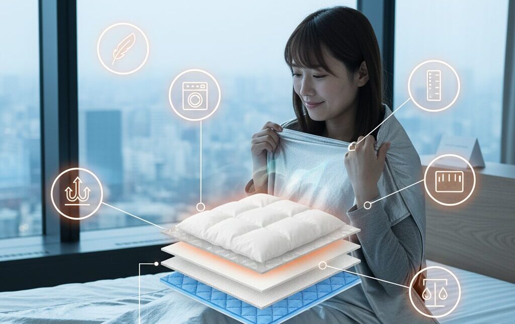 冬場、羽毛布団と毛布を併用する際、その順番に悩む方は多いです。結論は「使用する毛布の素材によって変える」のが正解です。