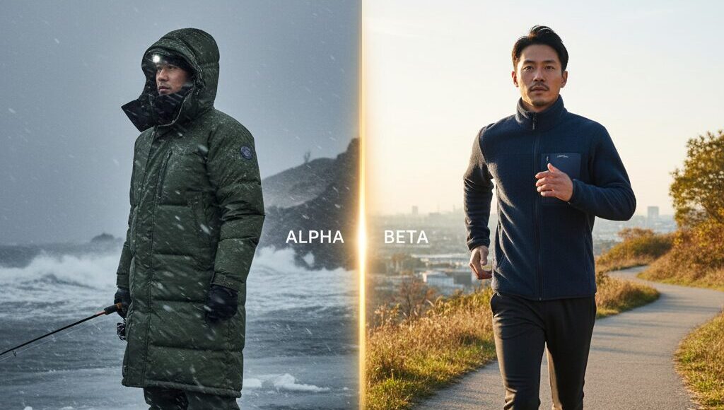 つまり「α」は、極寒地での作業や、冬のキャンプ、釣り、天体観測、悪天候(大雨や吹雪)の中など、「動かない」状態で最大限の保温と防水が必要な、過酷な環境(ヘビーデューティ)向けの最上位モデル、ということですね。