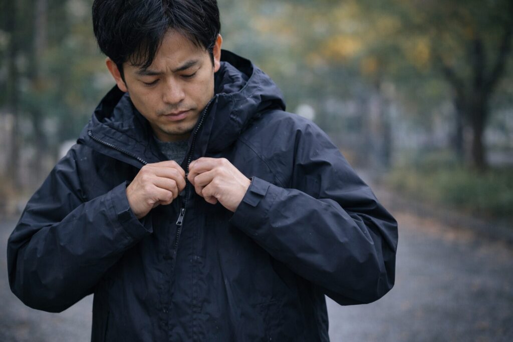 結論としては、春秋の単体は「暑い日もある」です。でもそれはデメリットというより、しっかりしたシェルの宿命に近いかなと思います。逆に言えば、風が強い日や、急な雨のときに頼れるので、着用前提を「万能の上着」ではなく、風雨に強いアウターと捉えると納得しやすいです。気温が上がる日は、脱ぎ着やジップ開閉で上手に合わせるのが現実的です。