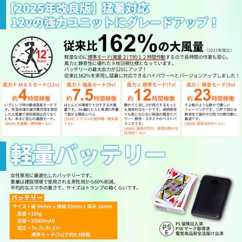 まず多くの口コミで挙げられているのが、手ごろな価格であるにもかかわらず高性能である点です。他社製品と比較して価格が抑えられているにもかかわらず、風量や通気性に優れ、夏場の屋外作業やレジャーシーンでも十分に活躍しているという声が目立ちます。特にバッテリーの持ち時間については「フル充電で1日中使えた」「炎天下でも快適だった」といった意見が多く、性能に満足している様子がうかがえます。