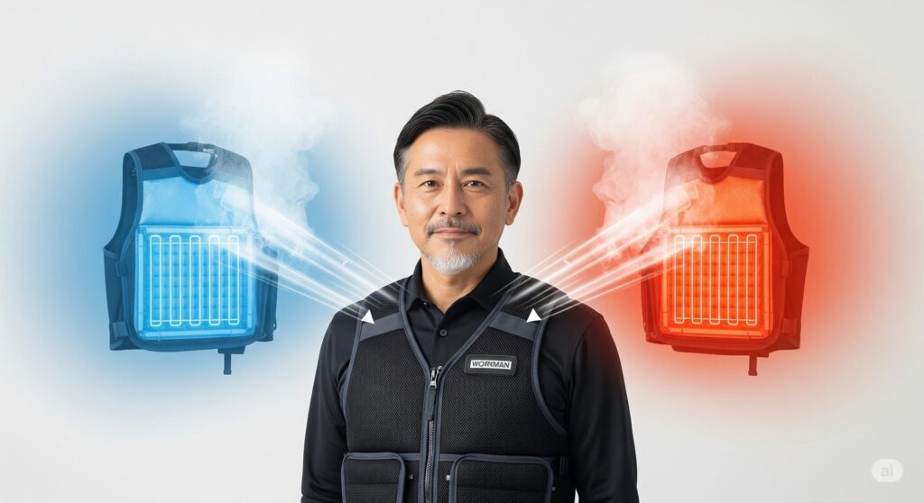 なお、これは「ワークマンの電熱ベストはどれくらい使えますか?」という疑問にも通じるものですが、ペルチェ式は従来の電熱線(ヒーター線)式とは異なり、デバイス自体が発熱する仕組みのため、スピーディーに温かさを感じられるのが特長です。