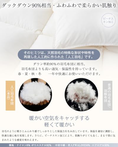 さらに、テイジンの人工羽毛布団も人気を集めています。テイジンの人工羽毛布団は、天然羽毛にアレルギーがある方やメンテナンスを簡単にしたい方に特におすすめです。テイジンの製品は、洗濯機で丸洗いできるタイプが多いため、清潔に保ちやすく、アレルギーリスクを避けたい方に向いています。人工羽毛でありながらも保温性に優れ、軽さとボリューム感も確保されているため、使い心地も天然羽毛に近いとされています。