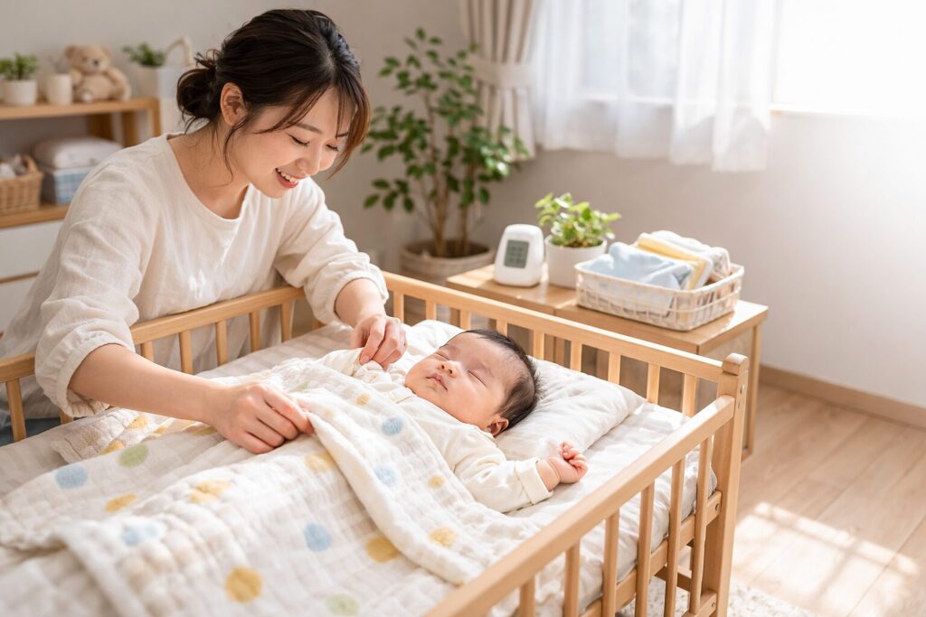 スリーパーを中心にすると、服装・室温・補助寝具の役割分担がはっきりします。まず服装でベースを作り、その上にスリーパーで安定感を足し、必要ならガーゼケットやタオルケットを補助で使う、という順番です。この考え方だと、掛け布団を主役にしなくて済むので、寝具の重さや顔へのかかり方を気にしすぎずに済みます。また、夜中の調整も「一枚外す」「袖の薄いものに替える」といった単純な動きで対応しやすいです。