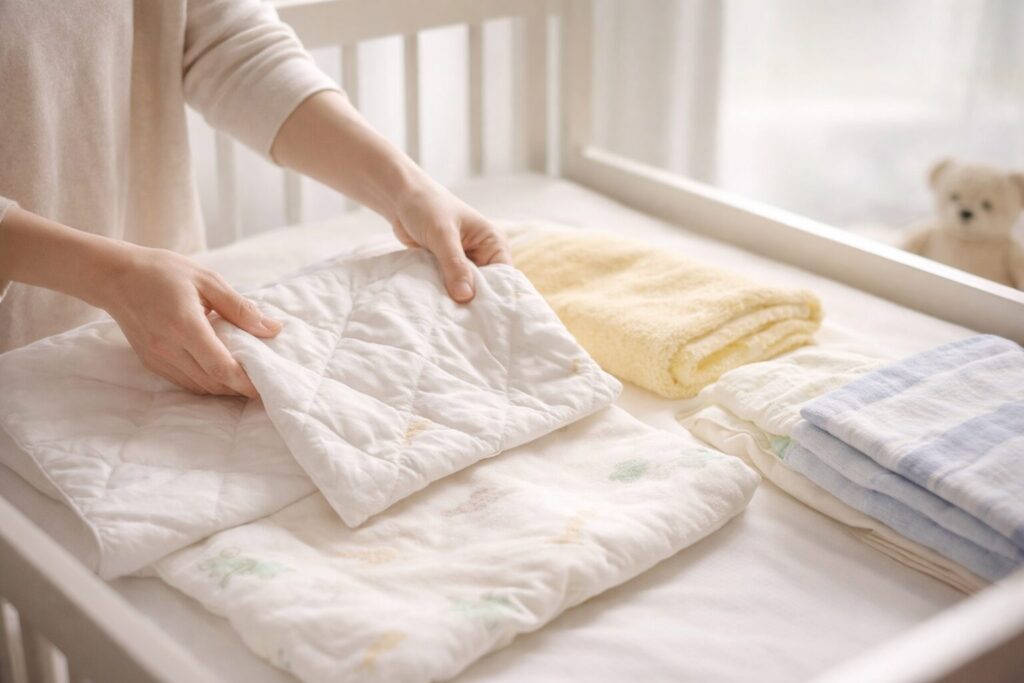春は寝具を軽くすることに意識が向きやすいですが、敷き布団が合っていないと、上に何を掛けても落ち着きにくいことがあります。寝返り前の新生児でも、頭の重みで沈みすぎる寝床は避けたいですし、敷きパッドやシーツの組み合わせでたるみが出るのも気になります。私は、硬めで平坦なベースに、防水シーツやキルトパッドをきれいに重ねて、ズレや隙間を作りにくい状態にしておくのが基本だと思っています。