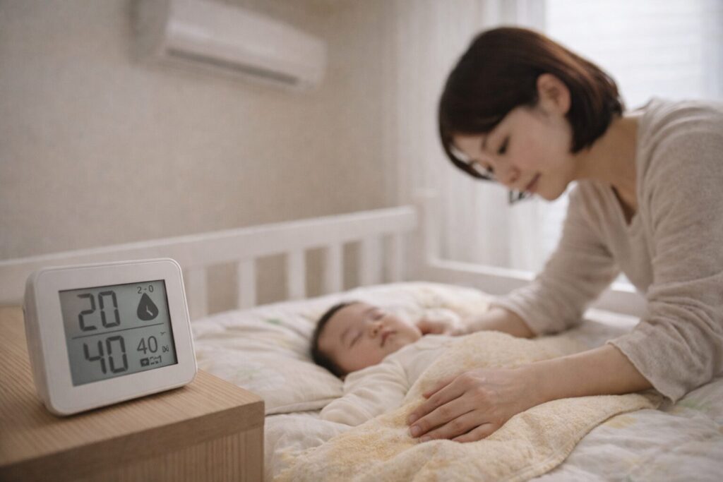 この記事で触れる室温、湿度、服装、寝具の組み合わせはあくまで一般的な目安です。赤ちゃんの月齢、体格、汗のかき方、住まいの断熱性、地域の気候差でも快適さは変わります。正確な情報は公式サイトをご確認ください。迷いが大きいときや体調面に不安があるときは、最終的な判断は専門家にご相談ください。