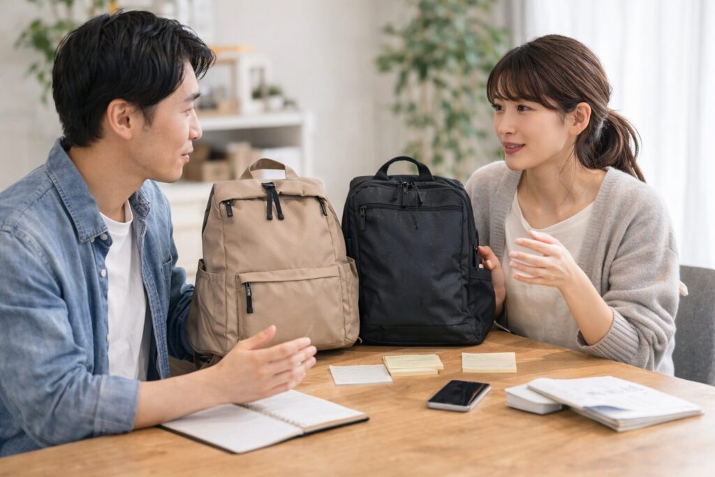 マザーズ用途で置き換えると、この違いはかなりわかりやすいです。たとえば、ショッピングモール中心の外出、駅までの短い移動、車移動がメインなら、軽くて扱いやすい高撥水モデルで十分満足できる人は多いと思います。逆に、自転車送迎が多い、保育園まで歩く距離が長い、突然の雨に当たりやすい、外遊びの時間が長いといった生活だと、防水寄りのモデルを選ぶ意味が一気に大きくなります。私はここを「雨の強さ」だけでなく、雨に当たる時間と、濡らしたくない荷物の重要度で見るのが大事だと思っています。着替えやおむつ程度ならまだしも、母子手帳ケース、スマホ、財布、タブレット、仕事の書類まで一緒に持つなら、雨対策の優先度はかなり上がります。