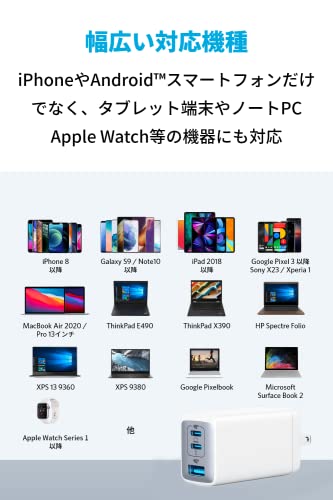 Anker PowerPort III 65Wは、65Wの出力を持つ充電器で、2つのUSB-Cポートと1つのUSB-Aポートを備えています。この充電器は、コンパクトで持ち運びに便利な設計となっており、旅行や出張に最適です。また、GaN技術を採用しており、効率的に電力を供給します。