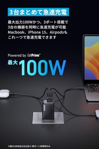 Anker Prime Wall Charger (100W, 3 ports, GaN)は、100Wの出力を誇る3ポート充電器です。この製品は、非常にコンパクトで軽量な設計となっており、持ち運びにも便利です。旅行や出張時にも、ノートパソコンやスマートフォンを同時に充電できるため、多くのユーザーに支持されています。さらに、GaN技術を採用しており、効率的に電力を供給します。