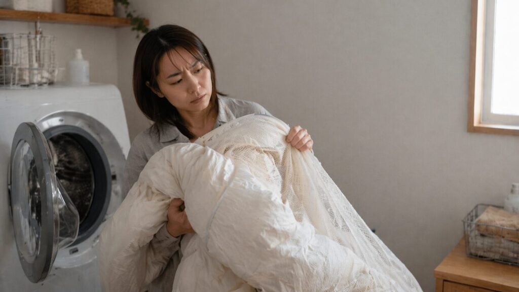 次に見ておきたいのが手入れの制約です。自宅で洗えるのは強みですが、何でも気軽に扱ってよいわけではありません。弱水流、洗濯ネット、乾燥機NGなどの条件があるので、「洗って乾かして終わり」の雑な運用とは少し相性が悪いです。また、なめらかな生地感を優先しているぶん、摩擦による毛玉や風合い変化への配慮も必要になります。このあたりは高機能寝具らしい面倒さとも言えますね。